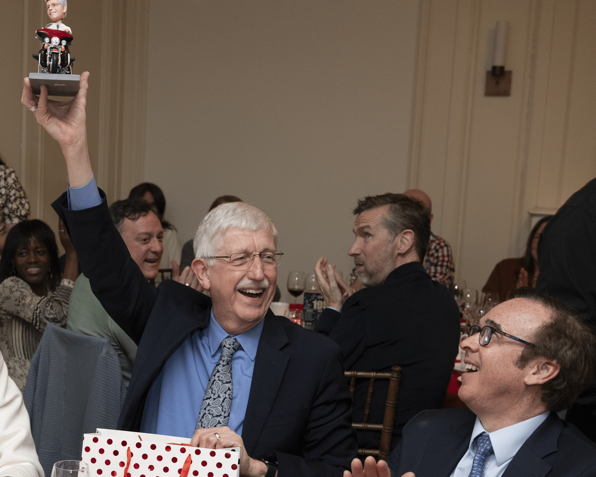 Now retired from NIH, Dr. Collins insisted, “I have not worked as hard since 2020.” Dr. Collins highlighted his work with NYSCF to automate the production of pancreatic organoids which facilitate research on the genetic causes of type 2 diabetes. He offered a heartfelt tribute to NYSCF, lauding its “remarkable scientists,” and its innovative, error-free “automated” robotic system. NYSCF in turn thanked Dr. Collins with a special birthday gift—a lookalike bobblehead bestriding a toy motorcycle (cycling and guitar remain this Renaissance man’s extracurricular passions).