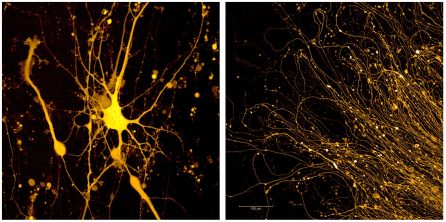 The oligodendrocytes to the left were made from the stem cells of a healthy donor, and comparing them to oligodendrocytes derived from multiple sclerosis patients helps researchers understand how the disease develops.