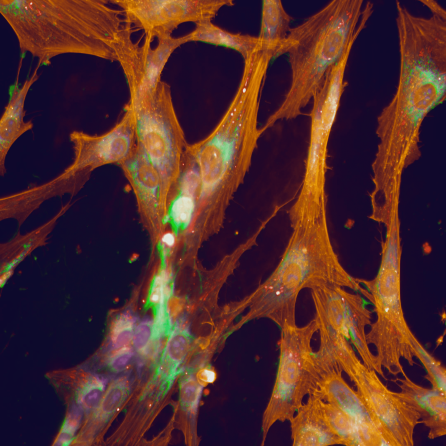 Skin cells collected from a PD-GBA patient stained to show different cellular components